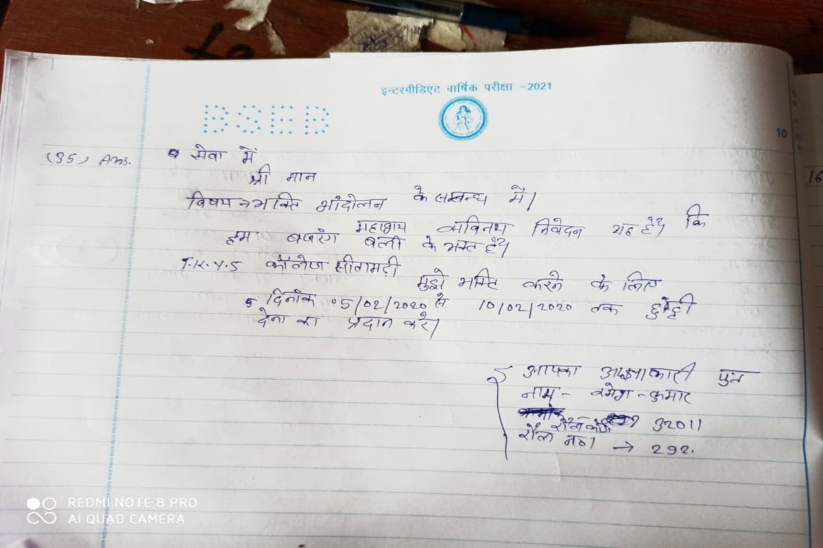 एक परीक्षार्थी ने भक्ति आंदोलन के प्रश्न पर बजरंगबली की भक्ति के लिए छुट्टी का आवेदन ही लिख दिया. ऐसे उत्तर पढ़कर लोग सोशल मीडिया पर अपने तरीके से प्रतिकिर्या दे रहे है. जिले के चार केन्द्रों पर इंटरमीडिएट परीक्षा के उत्तरपुस्तिका का मूल्यांकन किया गया. इस मामले पर जिला शिक्षा पदाधिकारी संजय चौधरी से पूछा गया तो उन्होंने कहा कि सबसे पहले वो इसकी जांच कराएंगे कि यह आंसर शीट किस केंद्र की है.