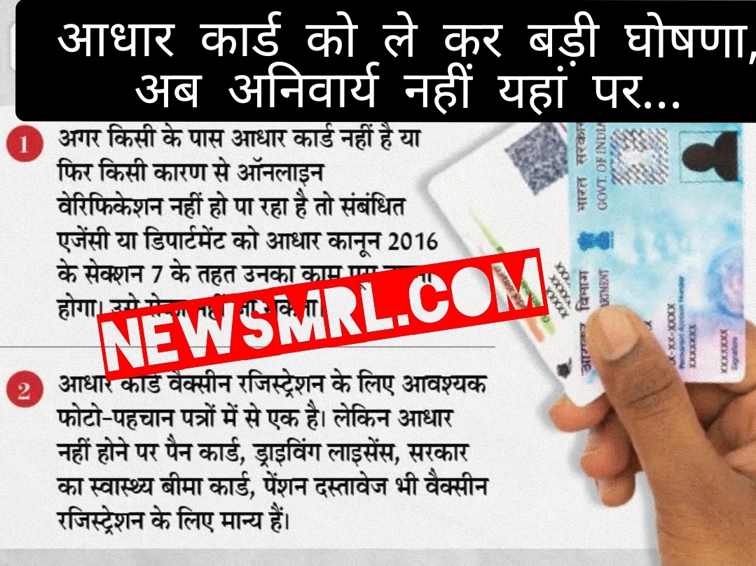 Big Breaking- UIDI ने जारी किए नए निर्देश, कोरोना से जुड़े किसी भी काम के लिए आधार जरूरी नहीं, वैक्सीन रजिस्ट्रेशन के लिए पैन और ड्राइविंग लाइसेंस काफी