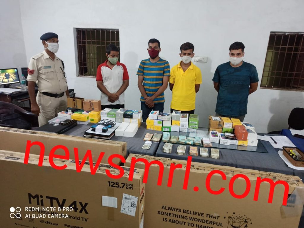 इस प्रकार चारो आरोपीयो से 75 नग मोबाईल , 04 नग लेपटाप , 03 नग 50 इंच एल 0 ई 0 डी 0 टीव्ही 0 , आदि विभिन्न इलेक्ट्रानिक उपकरण एवं नगदी 304800 / रु बरामद हुए है ।