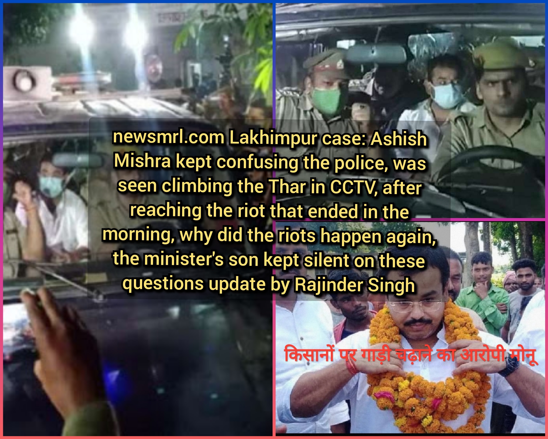 असल सबूत है एक सीसीटीवी फुटेज – पुलिस की जाँच टीम के पास एक सीसीटीवी फुटेज है जिसमें थार गाड़ी में बैठते हुए और जाते हुए आशीष मिश्र मोनू स्पष्ट दिखाई दे रहे हैं. इस फुटेज के बाबत पूछे गये सवाल पर आशीष निरुत्तर हो गये. इसके बाद क्राइम ब्रांच के इंस्पेक्टर विद्याराम दिवाकर ने पुलिस कस्टडी रिमांड की अर्जी देते हुए अदालत से गुहार लगाई कि 12 घंटे तक चली पूछताछ के दौरान आशीष द्वारा सवालों के भ्रमित करने वाले जवाब दिये और अन्य सवालों के जवाब देने के स्थान पर वे बार-बार मौन हो गये. इसके अलावा उन्होंने गलत और मिथ्या जानकारी देकर बचने का प्रयास करने का प्रयास किया.